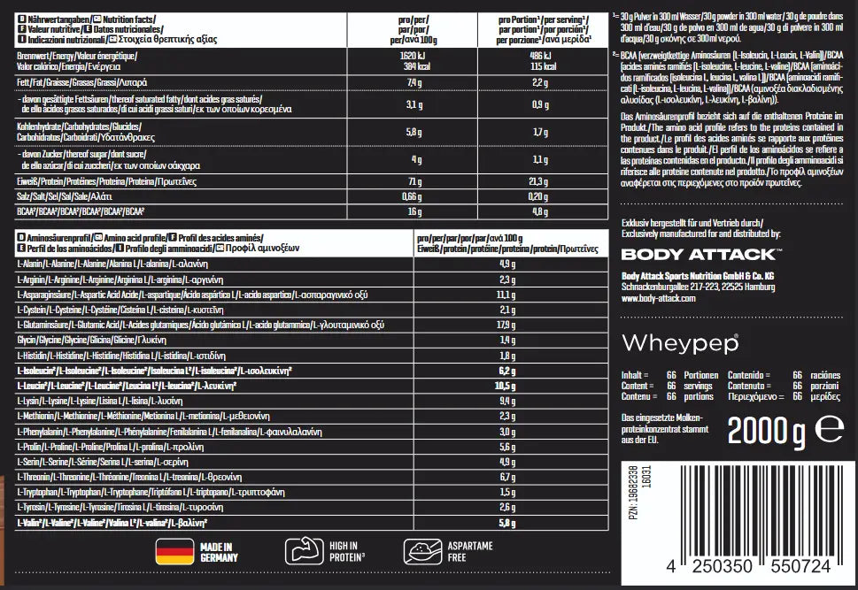 Want to boost muscle growth? Has a defined body always been your dream? This protein will get you motivated! High-quality whey protein is made from ultra-filtered pure whey protein concentrate and hydrolysate. The high BCAA content and rich protein content provide the right amount of muscle growth. Fast-dissolving and a creamy, light taste make 100% whey protein a must-have for your dream body!
