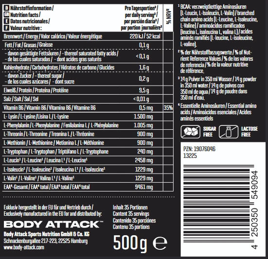 Maisto papildas su saldikliais. Didelė nepakeičiamųjų aminorūgščių koncentracija miltelių pavidalu su vitaminu B6. Skonis: apelsinų. Maisto papildai neturėtų būti vartojami kaip įvairios ir subalansuotos mitybos bei sveiko gyvenimo būdo pakaitalas. Laikyti mažiems vaikams nepasiekiamoje vietoje.