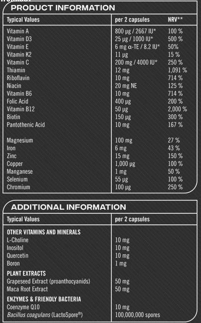 Magnio citratas, kieta želatinos kapsulė (galvijų želatina, juodasis geležies oksidas), vitaminas C (L-askorbo rūgštis), užpildas (mikrokristalinė celiuliozė), žaliosios arbatos ekstraktas, vynuogių sėklų ekstraktas, cinko bisglicinatas, L-cholino bitartratas, maka šaknies ekstraktas, cinamono žievės ekstraktas, vitaminas K2 MK7 (K2VITAL® Delta), selenu praturtintos mielės, vitaminas E (D-alfa tokoferilo acetatas), vitaminas B5 (kalcio D-pantotenatas), kvercetino dihidratas, vitaminas B3 (nikotinamidas), vitaminas B6 (piridoksino hidrochloridas), vitaminas B2 (riboflavinas), inozitolis, vitaminas B1 (tiamino hidrochloridas), natrio boratas, lipnumą reguliuojanti medžiaga (magnio stearatas), Bacillus coagulans (LactoSpore®), vitaminas D3 (cholekalciferolis), vario bisglicinatas, kofermentas Q10 (ubidekarenonas), vitaminas A (retinil Acetatas), mangano bisglicinatas, piperinas (BioPerine®), daugiakomponentės apsaugotos pieno rūgšties bakterijos (Lactobacillus acidophilus, Lactobacillus rhamnosus, Bifidobacterium bifidum), chromo pikolinatas, vitaminas B9 (folio rūgštis), vitaminas B7 (D-biotinas), vitaminas B12 (metilkobalaminas). Gali būti žuvų, vėžiagyvių ir (arba) pieno pėdsakų.